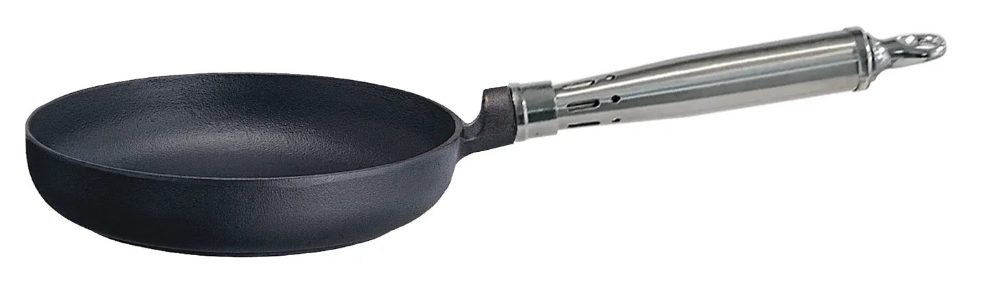 En praktisk stekpanna på Ø20 cm med rund kant – perfekt för mindre portioner, ägg, pannkakor eller tillbehör. Pannan är tillverkad i gjutjärn som ger jämn värmefördelning och lång hållbarhet. Det rostfria värmeventilerade skaftet gör den bekväm att använda även vid höga temperaturer.