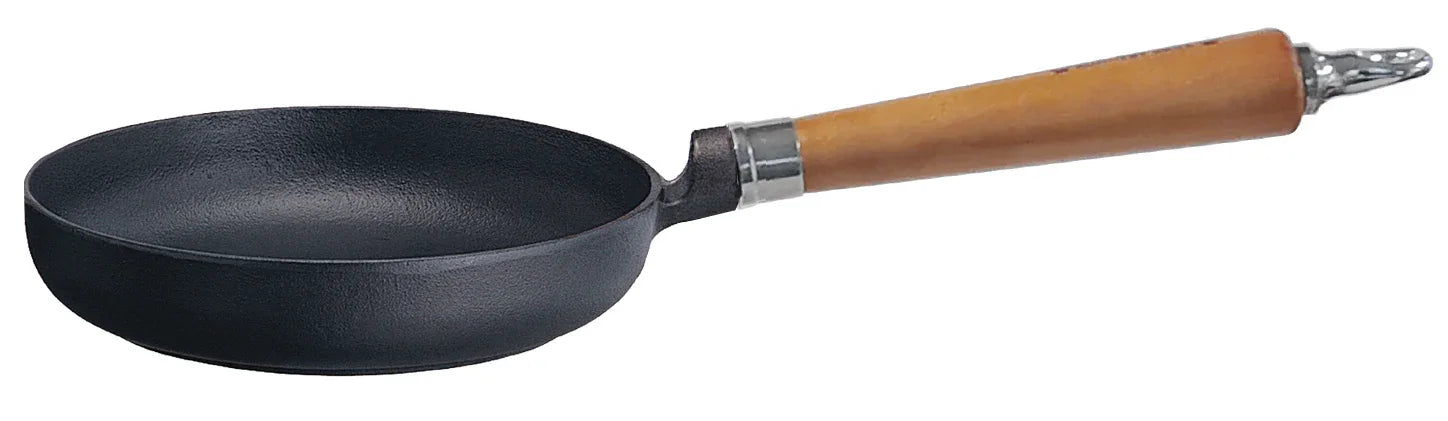 En klassisk stekpanna på Ø20 cm med rund kant – perfekt för mindre portioner, ägg, pannkakor eller tillbehör. Pannan är tillverkad i gjutjärn som sprider värmen jämnt och håller den länge, vilket ger bästa möjliga stekresultat. Handtaget i brunlaserat bokträ ger ett bekvämt grepp och en rustik känsla som passar i alla kök.