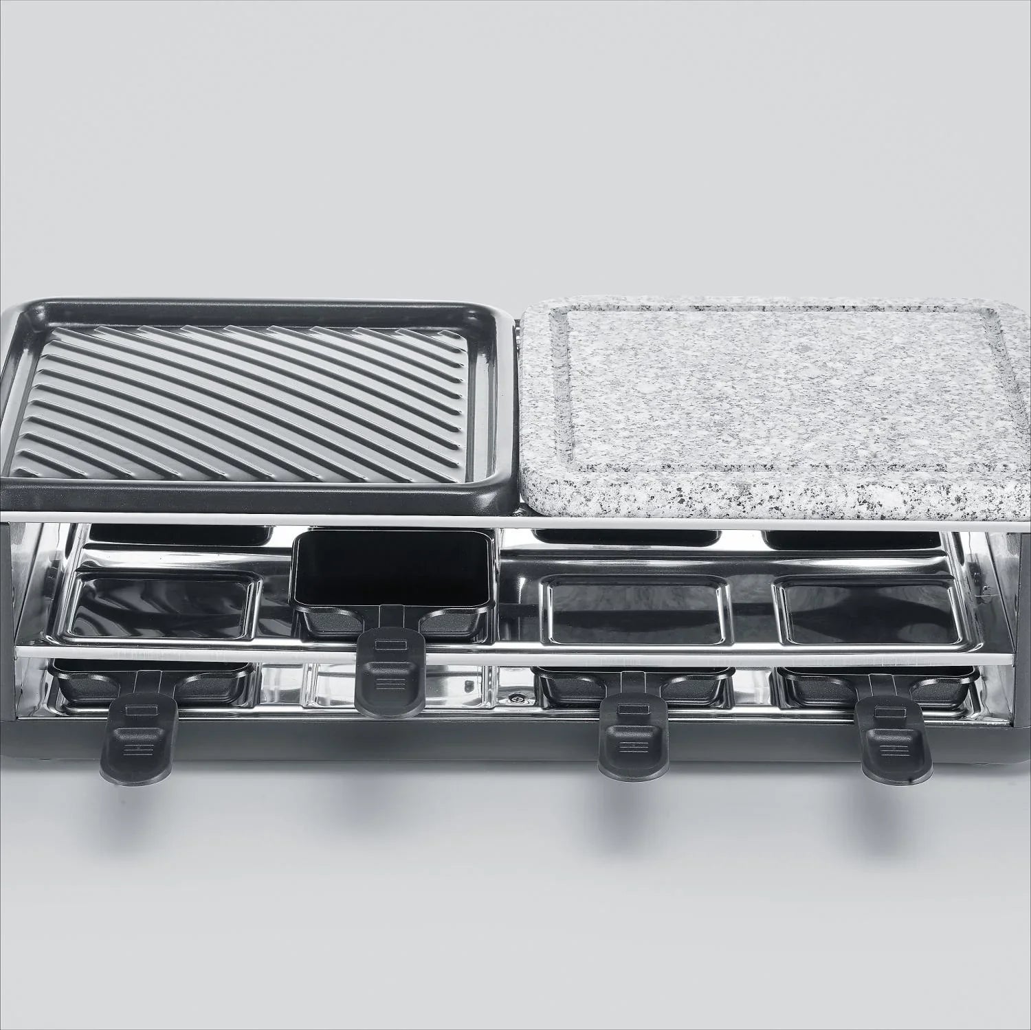 Bjud in dina vänner till en mysig middag med raclette som huvudattraktion. Låt era smaklökar dansa av glädje när ni fyller de små raclettepannorna med era personliga favorittillbehör och njut av den underbara kombinationen av smaker och dofter. Medan osten smälter och gratineras i pannorna, kan ni samtidigt njuta av att steka köttet på grillplattan som har en keramisk beläggning. Denna modell har den nya smarta parkeringsytan där du enkelt kan ställa de pannor som du inte använder för stunden.
