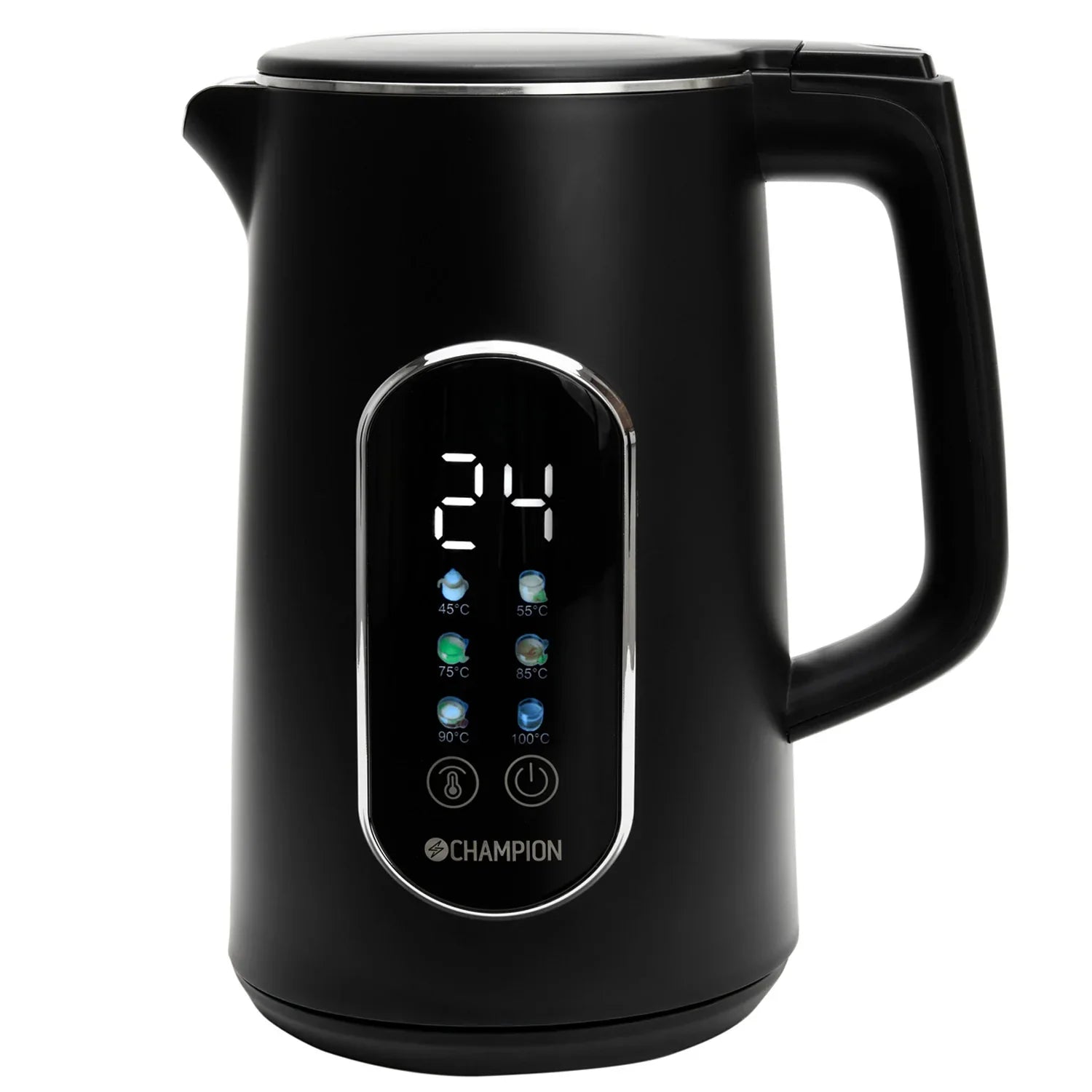 Champions Vattenkokare Digital Temp i en stilren mattsvart design ger dig full kontroll över vattnets temperatur. Den passar bra för téälskare, barnfamiljer och restauranger som vill ha rätt temperatur varje gång.